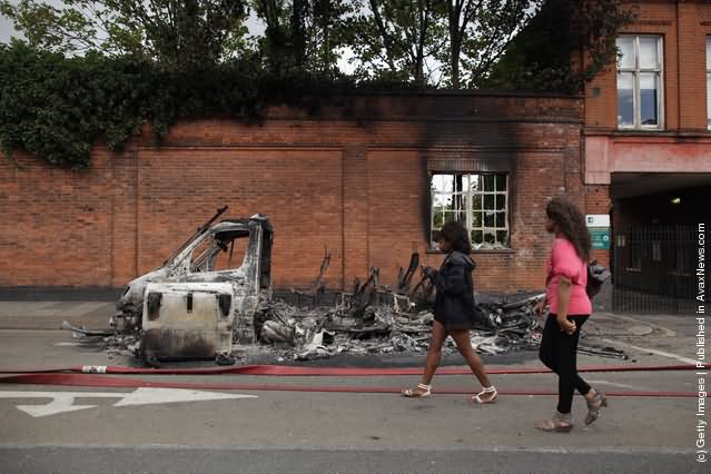 People walk past a burnt out van after riots on Tottenham High Road on August 7, 2011 in London, England. (Photo by Dan Kitwood/Getty Images)