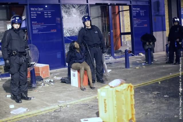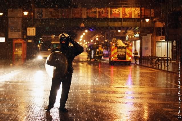 A police officer standing at Brixton High glaring at the streets after looting broke out on August 8, 2011 in London, England. Widespread rioting and looting took place across many parts of London in the early hours of Monday morning in a reaction to earlier rioting in Tottenham in North London. Major disturbances broke out late on Saturday night in Tottenham and the surrounding area after the killing of Mark Duggan, 29 and a father-of-four, by armed police in an attempted arrest on August 4. (Photo by Dan Kitwood/Getty Images)