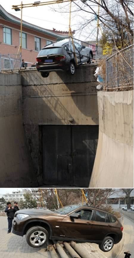 A car which hot stuck near the cliff and just managed to survive from falling.