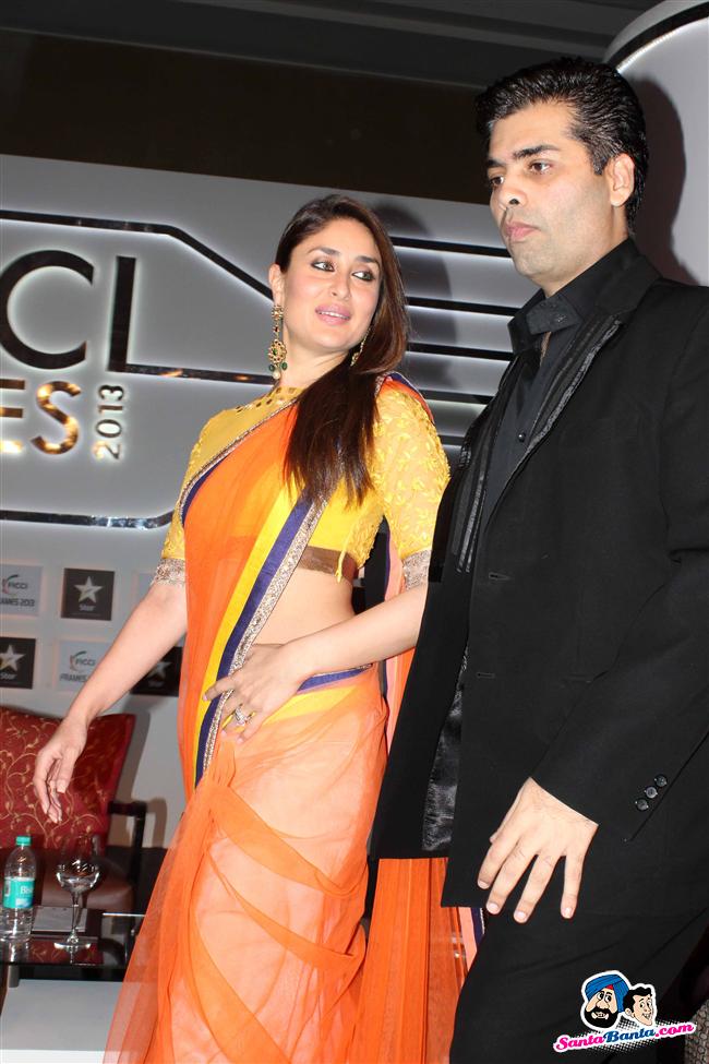 Ficci Frames event 2013 saw some of the biggest stars of Bollywood gather in a forum. Mostly it was girl power. Remembering the Mr. Yash Chopra for his years of hard work in the Bollywood industry also present at the event was Karan Johar, Kareena Kapoor, Kajol, Kamal Hassan, etc.Here are hot pictures of Kareena Kapoor Khan from FICCI Frames 2013 wearing orange color saree and posing infront of the camera. Kareena is known for her style and fashion statment. Her plain soothing color saree with blue and yellow border is simple yet elegant in design, while her navel can be seen.