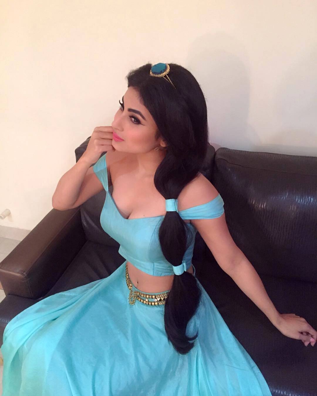 Mouni Roy in blue Disney Jasmine Princess dress cosplay