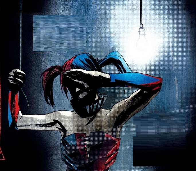 Harley Quinn looks around the room which is illuminated by a single light bulb, she calls out to check if Joker’s there. No one has seen him in a year, since he cut his face in Arkham Asylum; So she looks around confused – Joker had asked her to come to this place but it’s dark and seems like no one is here. Joker calls from the darkness asking her to take off all of her clothes, she does as she’s asked, stripping down to no clothes and then she’s handed over a suit and realizes that she’s about to be of Joker’s height. She exclaims that she’s gonna look just like him, and Joker exclaims “That’s the point!” But there’s one thing wrong – your pretty face spoils everything, I need to remove it! She retorts “Won’t it hurt”, “Oh yeah tremendously you’ll never experience a worst pain in your life, but worst part is the eyes!” She panics and screams “No!” Joker moves quickly and slashes her face.
